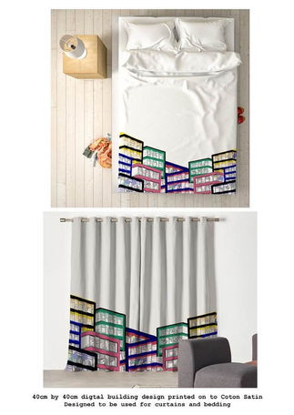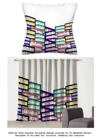 The interiors collection ‘Building Conversation’ was created using hand-drawn imagery which was digitally manipulated in Photoshop and later printed onto cotton satin. Beth’s goal was to create a design which provokes conversation straying away from the more traditional interior styling, embracing colour, abstract and geometrics. The piece itself utilised the combination of Swansea architecture with imagery from within the Walker Art Gallery and Tate in Liverpool, greatly influenced by their recent OP Art exhibition. Inspired by Deborah Bowness, Memphis Art and Curious Egg, she looked at artists and designers that pushed the boundaries creating bold, quirky, outgoing statement pieces something which she has embraced within her own designs.
